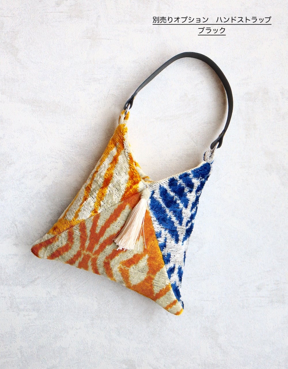 It's a fluffy and lightweight bag made from silk velvet Ikat fabric sourced from Turkey.