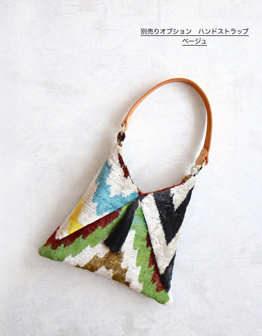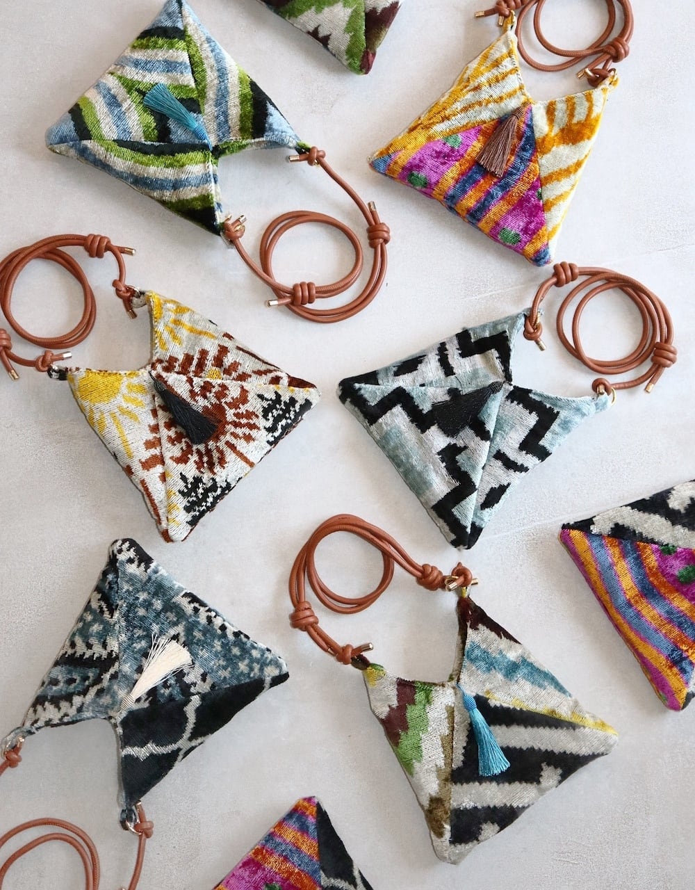 It's a fluffy and lightweight bag made from silk velvet Ikat fabric sourced from Turkey.