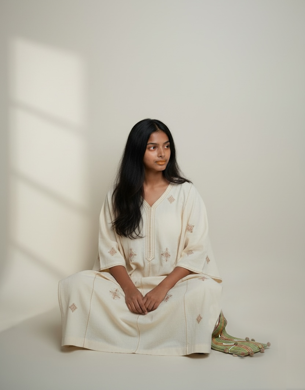 手織りの綿素材に、伝統的なモチーフを施した