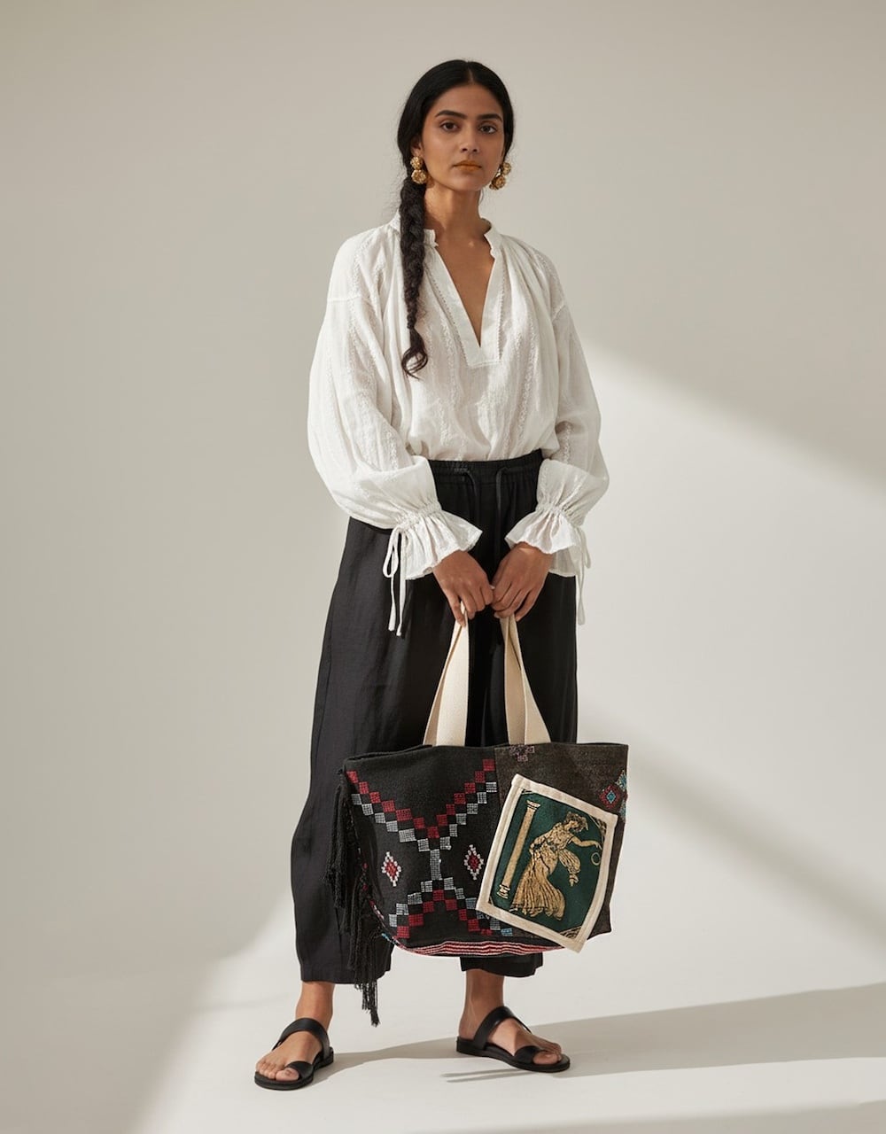 前後に異なるデザインが施されたこのトートは、個性的な存在感を放ち、